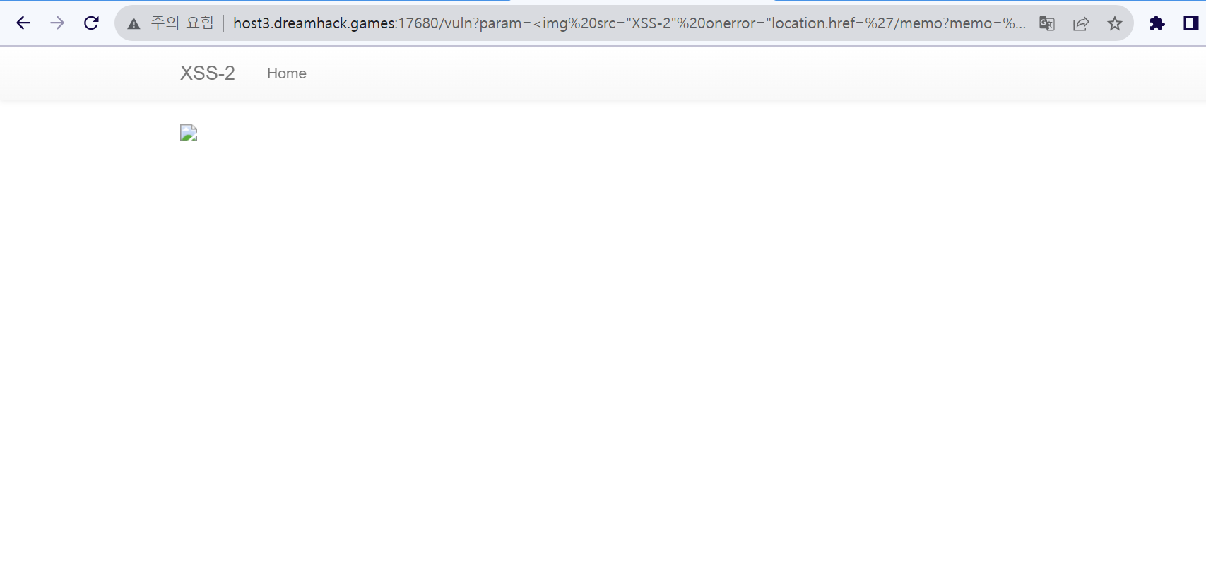 이때 /vuln 페이지의 param에 해당 익스플로잇 코드를 입력하면 이미지 로딩에 실패한 화면이 보여지는 것을 확인할 수 있다
