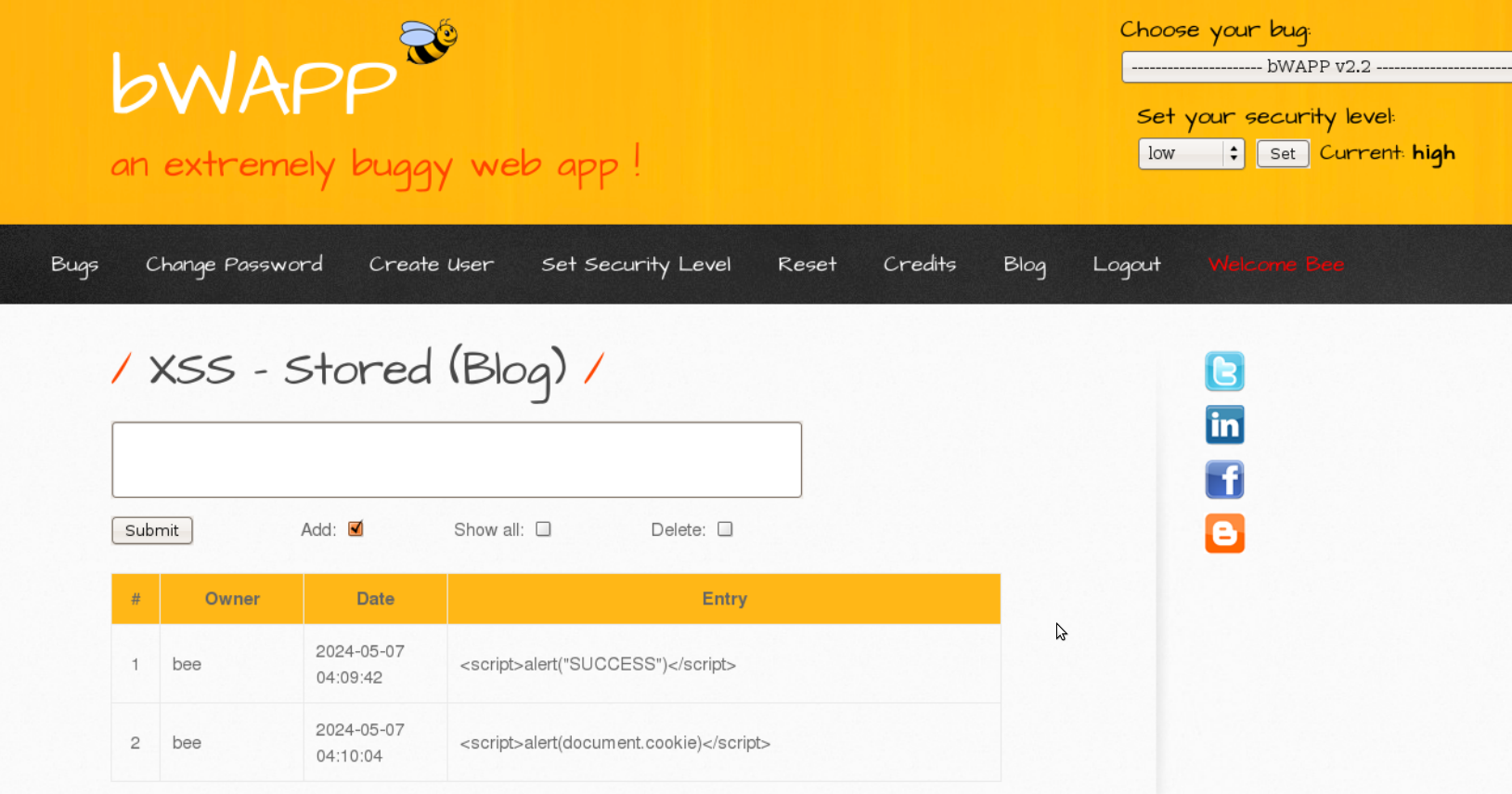 xss_stored_1.php에서 난이도가 high일 때 htmlspecialchars(특수문자를 우회시키는 함수)를 사용하는 xss_check_3를 사용하기 때문에 입력한 스크립트가 문자 그대로 출력된다
