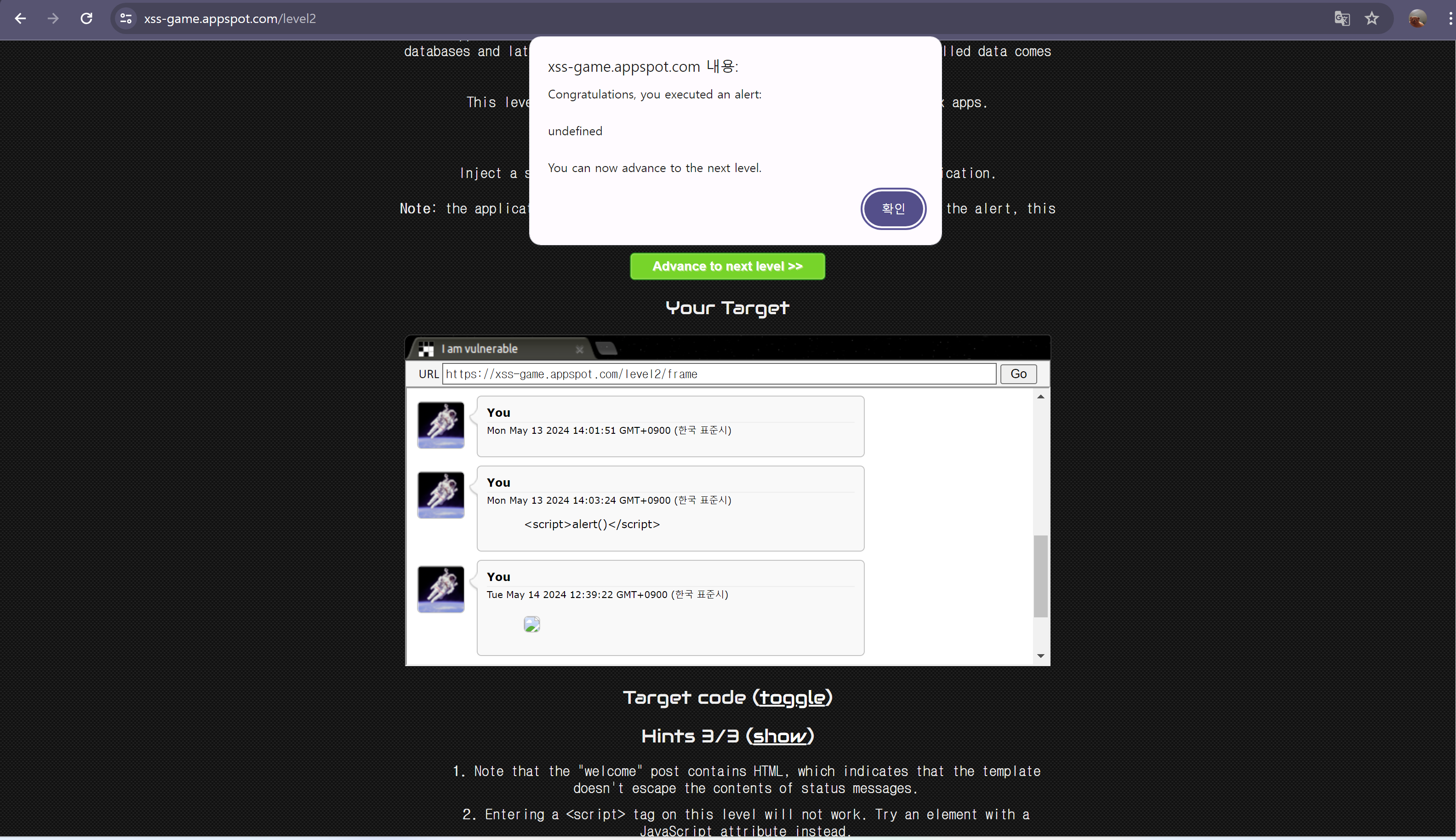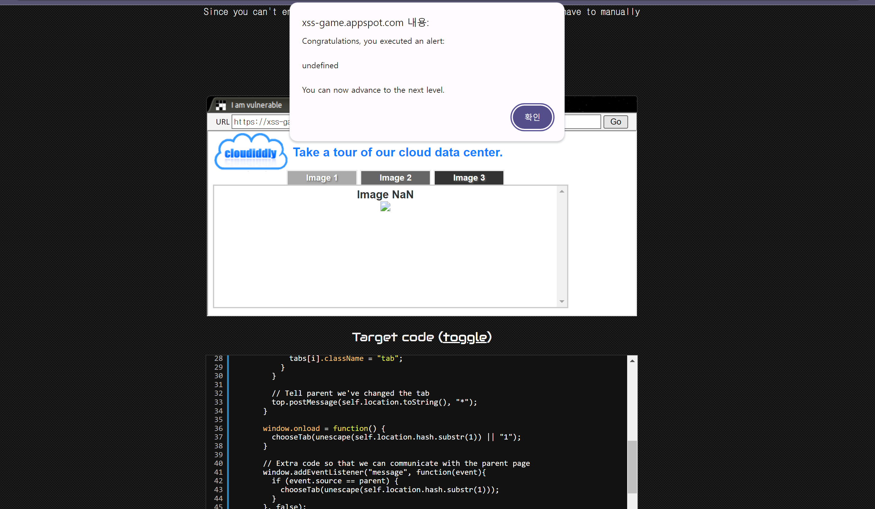 힌트 확인 -> img 태그의 src가 정상적인 경로가 아닐 때의 onerror 속성을 이용해 alert를 띄운다