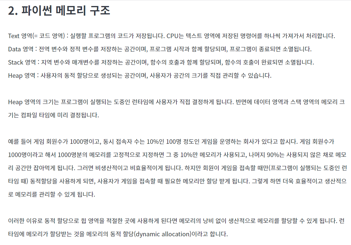 위 이미지를 보면 python은 stack, heap memory 두 가지를 사용합니다. stack memory에는 참조자가 저장되고 heap memory에는 객체가 저장됩니다. 기존에 C++, Java와는 다르게 메모리에 값이 들어가는 형태가 아닌 heap memory에 객체가 생성(int, string, class 등)이 되면 변수에서 그곳을 참조(reference)하는 형태로 메모리 할당이 됩니다.