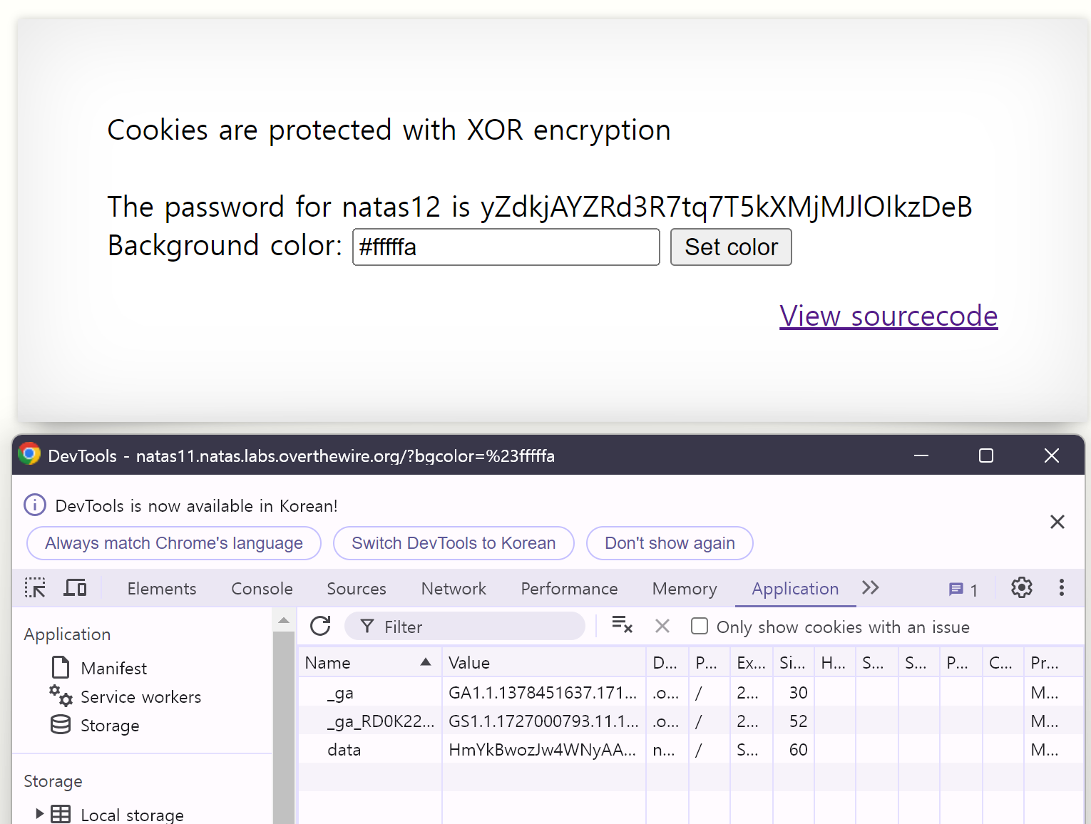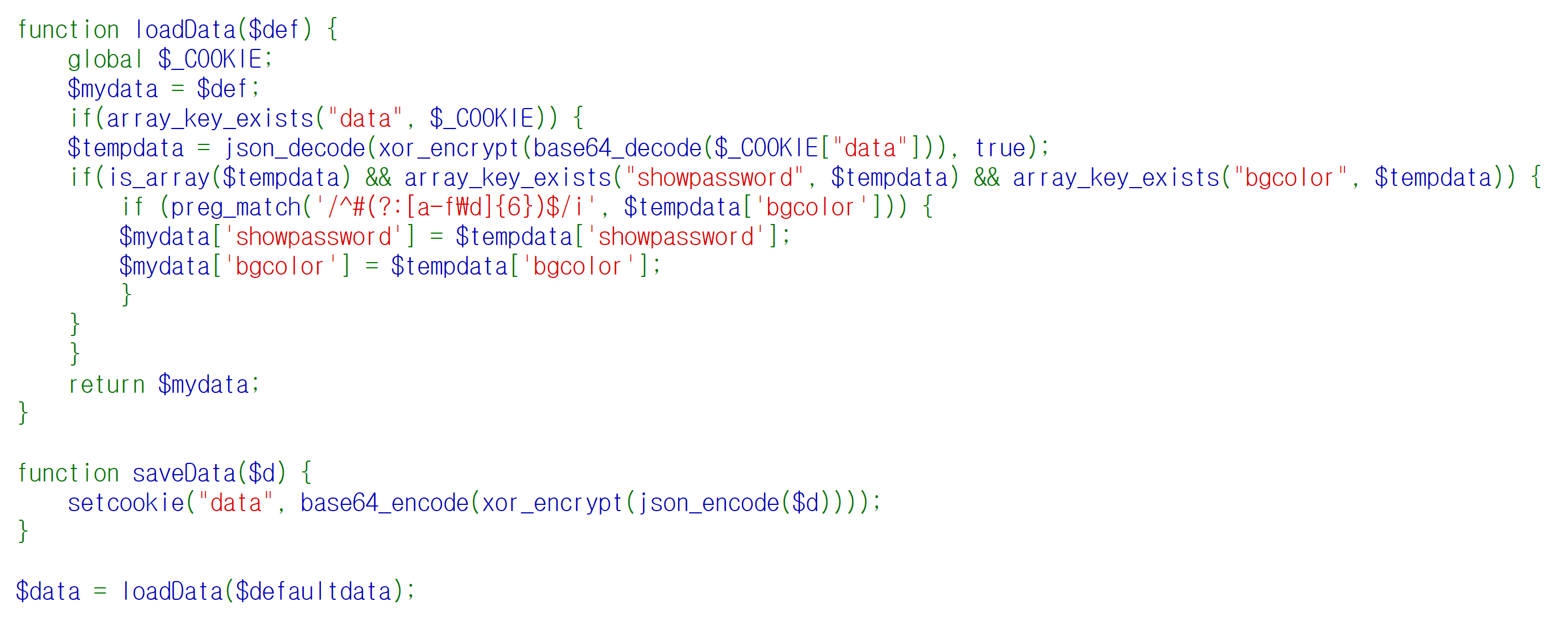 base64_decode($_COOKIE["data"])를xor연산하고 또 json_decode한 array의 showpassword가 yes여야 함