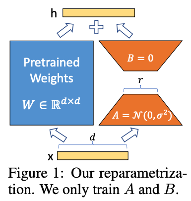 따라서 LoRA는 를 곱해서 같은 차원이 되는 두 개의 더 작은 행렬 로 표현하여 이를 달성하고자 합니다. 만약 이 방식을 사용하지 않는다면 를 로 계산하겠지만, 이를 차원을 가지는 와 차원을 가지는 로 표현함으로써 파라미터 수를 크게 줄일 수 있습니다.