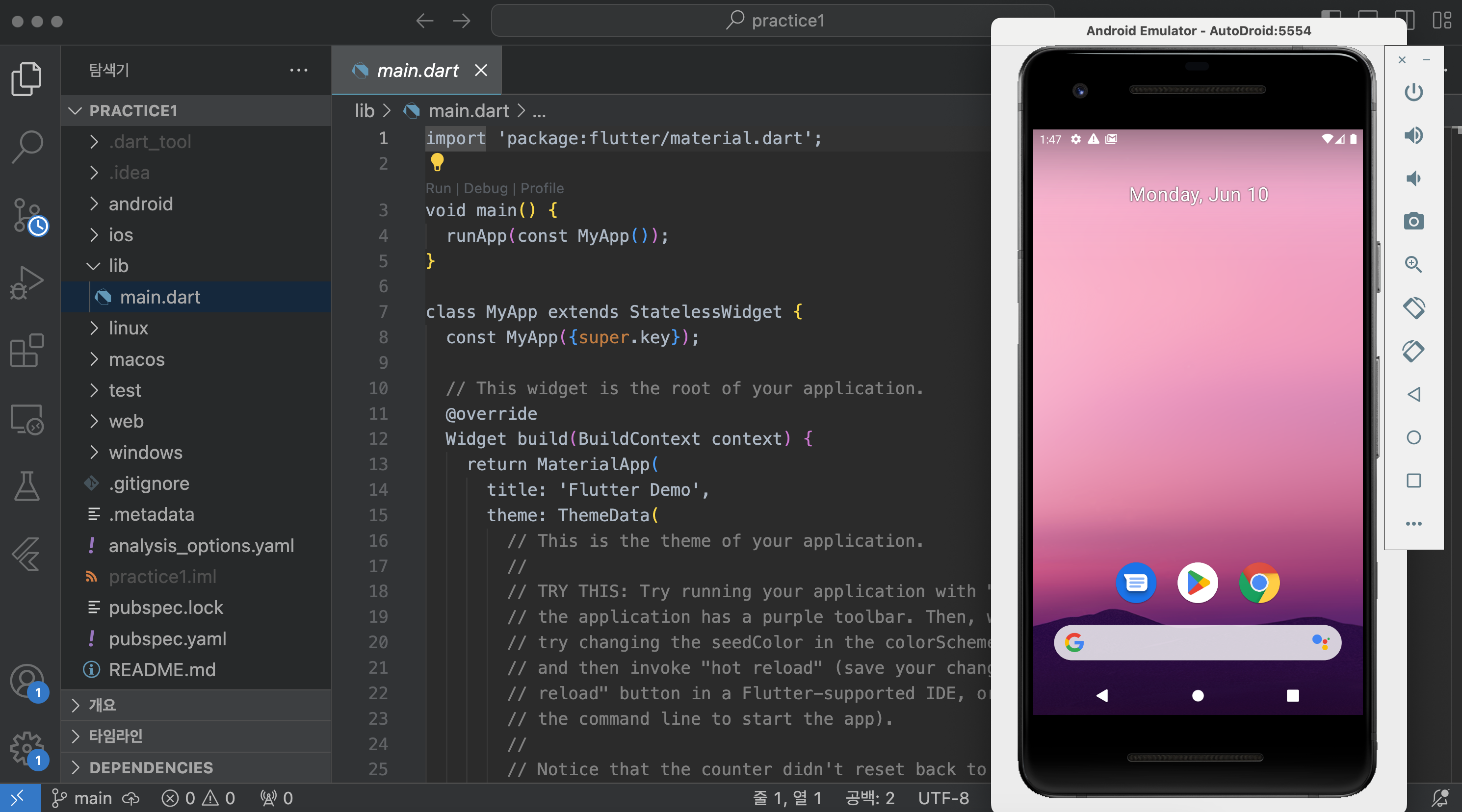 Flutter: Run Flutter Doctor : Flutter 실행 Flutter: New Project : New project 생성Flutter: Launch Emulator : Android Studio에서 생성해둔 Virtual Device 띄우기