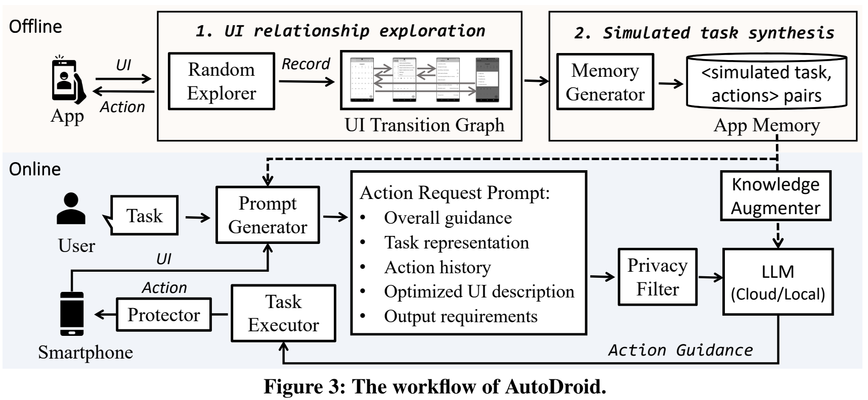 따라서, AutoDroid는 UI graph를 보면서 시뮬레이션을 돌림. 이런 시뮬레이션 데이터를 가지고 LLM은 user task를 어떻게 실행할지 학습하게됨.