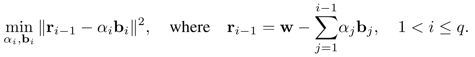 만약에 multi-bit quantization이라면, 그리디 알고리즘을 이용할 수 있다. 처음은 그리디 알고리즘을 이용해서 binary matrices와 scaling factor를 초기화한 후에, i번째 bit부터는 (i-1)번째 bit로부터 residual r를 최소화하는 방식으로 quantization을 진행한다.