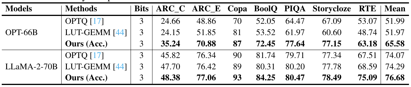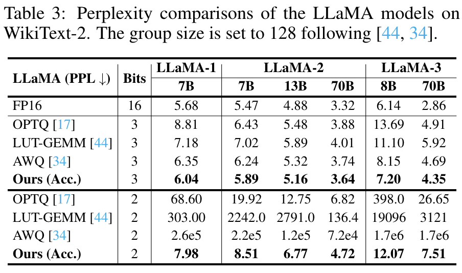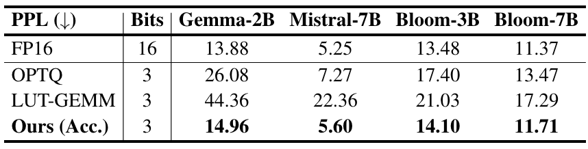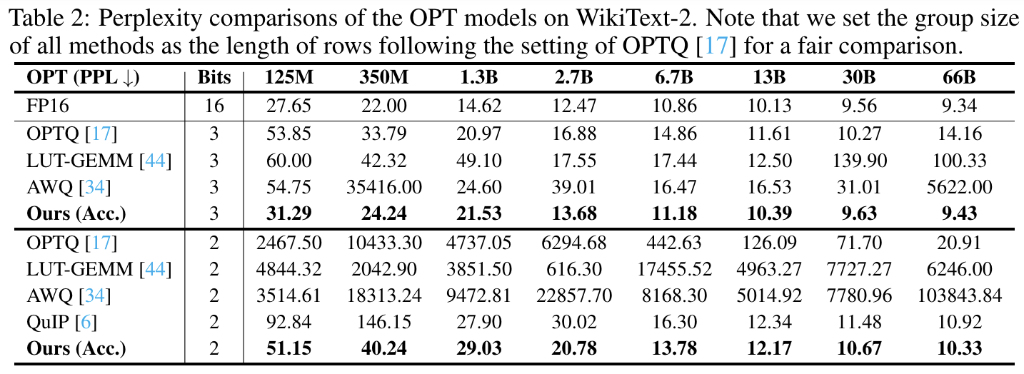 3 bit, 2 bit 모두 다른 OPT 모델들에 비해 월등하게 낮은 perplexity를 보여주고 있다.