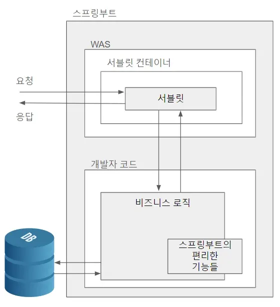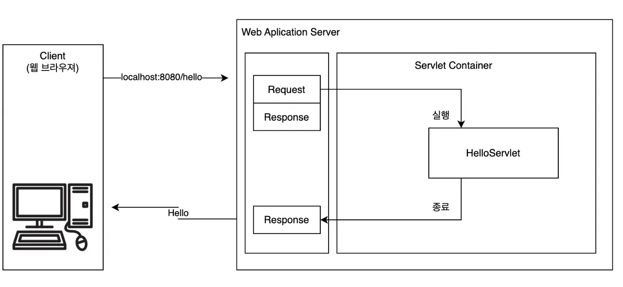 Client 요청을 WAS에서 처리 -> 서블릿 컨테이너 -> 서블릿 객체 생성/호출 -> Response 반환