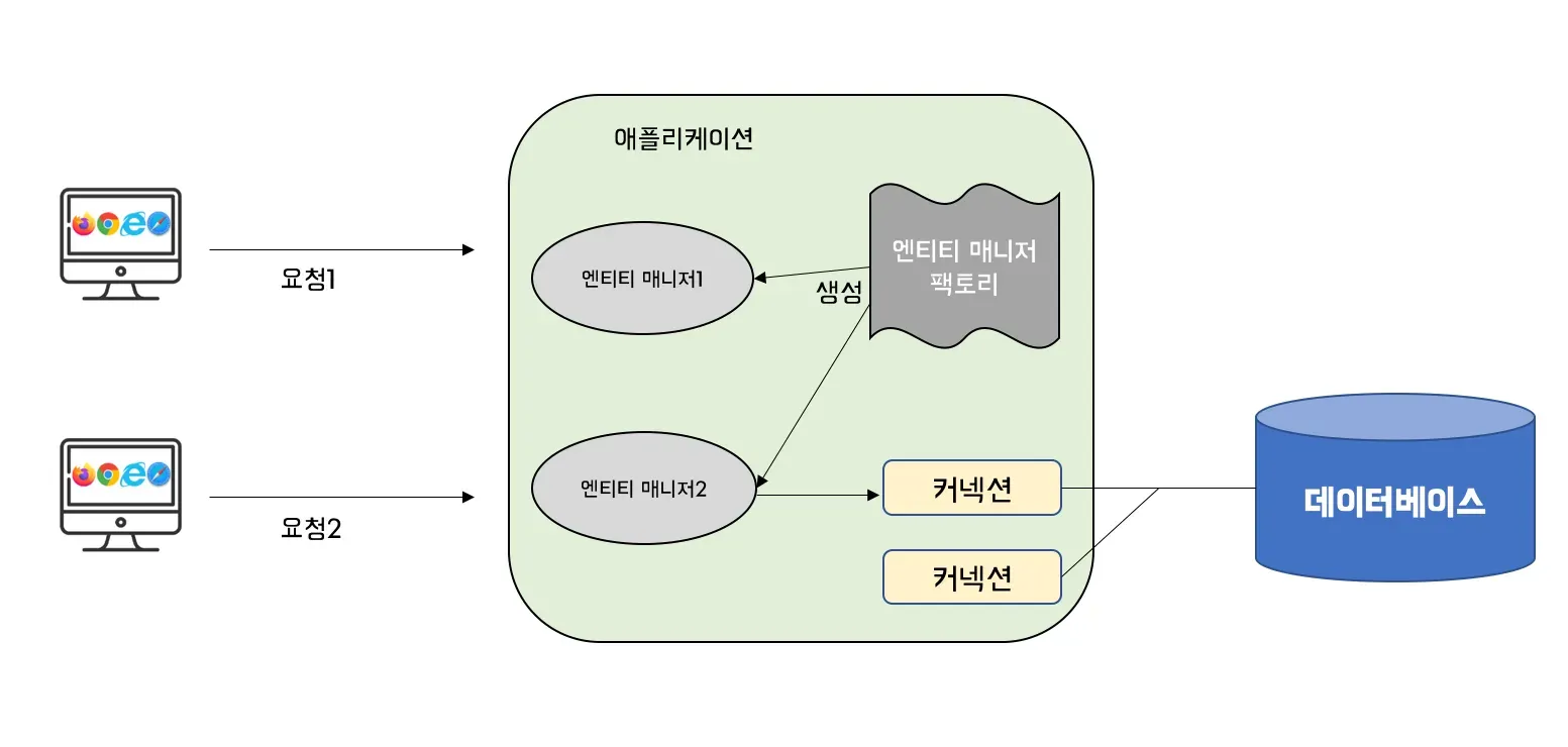 엔티티를 관리해 데이터베이스와 애플리케이션 사이에서 객체를 생성, 수정, 삭제하는 등의 역할을 한다. (엔티티 매니저를 만드는 곳이 엔티티 매니저 팩토리) 회원 2명이 동시에 회원가입을 하려는 경우 엔티티 매니저는 회원1의 요청에 대해 가입 처리 할 엔티티 매니저를 엔티티 매니저 팩토리가 생성하면 이를 통해 가입 처리해 데이터베이스에 회원 정보를 저장(회원 2도 같음) 하고, 회원 1, 2를 위해 생성된 엔티티 매니저는 필요한 시점에 데이터베이스와 연결한 뒤에 쿼리한다.