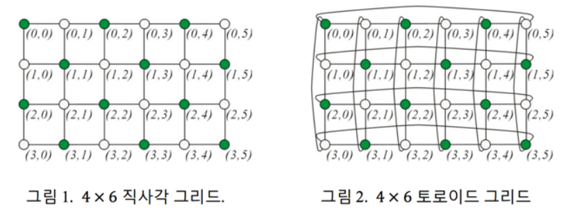 m × n 직사각 그리드의 모든 행 i ∈ {0, … , m-1}에 대하여 두 정점 (i, 0)과 (i, n-1)을 잇는 에지를 추가하고, 또한 모든 열 j ∈ {0, … , n-1} 에 대하여 두 정점 (0, j) 와 (m-1, j) 을 잇는 에지를 추가하면, 그림 2 에 보인 것과 같이 각 행은 길이 n인 사이클을 이루고 각 열은 길이 m인 사이클을 이루게 된다. 이렇게 만들어진 그래프를 종종 m × n 토로이드 그리드(toroidal grid) 라고 부르는데, 왜냐하면 이 그래프를 토러스(torus)에 에지가 교차하지 않도록 그릴 수 있기 때문이다.
