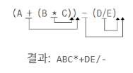 예를 들어 a+bc는 (a+(bc))의 식과 같게 된다. 그 다음에 안에 있는 괄호의 연산자 를 괄호 밖으로 꺼내게 되면 (a+bc)가 된다. 마지막으로 또 +를 괄호의 오른쪽으로 고치면 abc*+가 되게 된다.