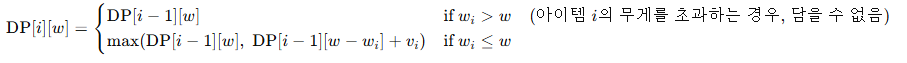 DP 테이블 DP[i][w]: 아이템 1부터 i까지 고려했을 때, 배낭 용량이 w일 때 얻을 수 있는 최대 가치