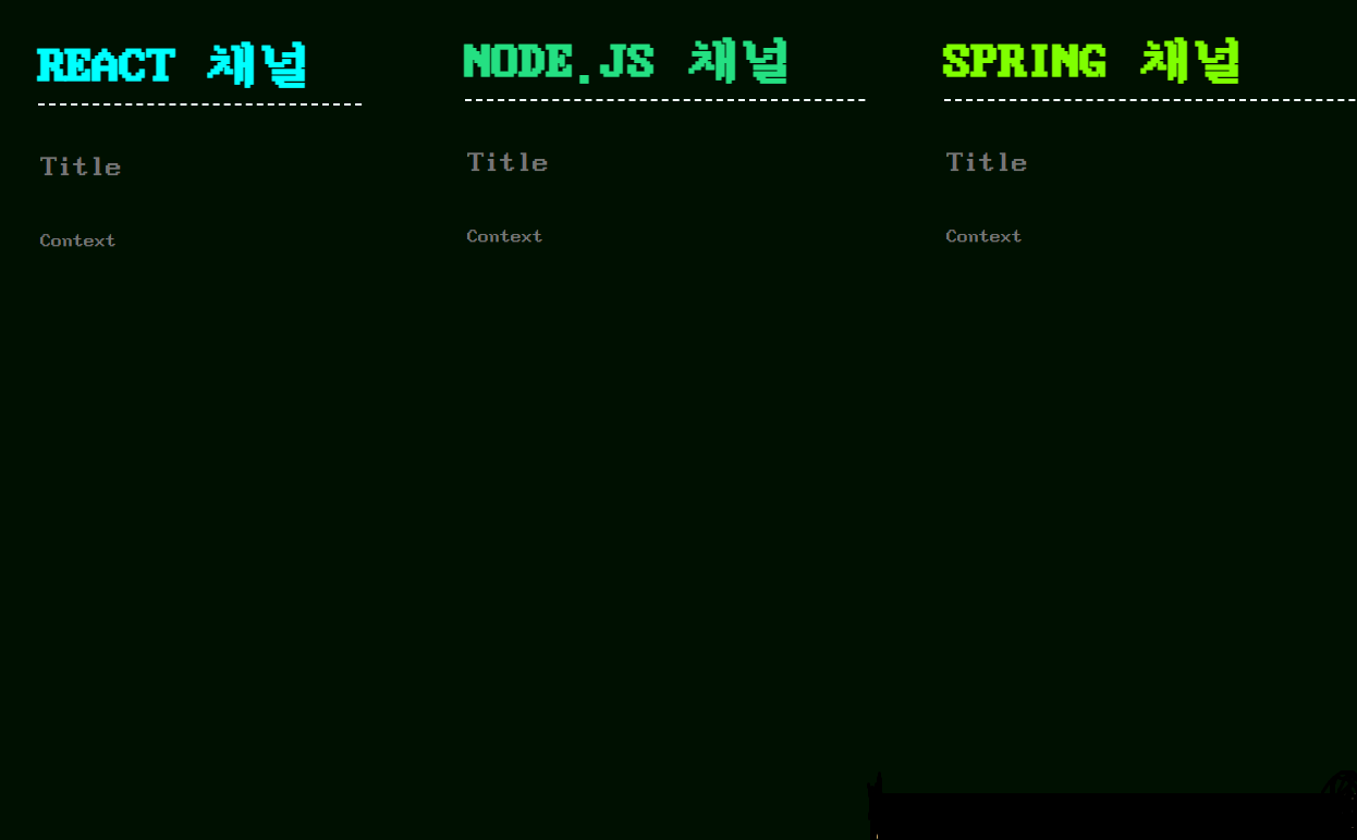 일단 Create부터 다 만들자 생각해서 글쓰는 API부터 만들었다. 일단 게시판에 3채널을 만들어놨다. React채널, Node.js채널, Spring채널 그럼 여기서 복잡해지는게 세개 다 다른 channel.html과 write.html과 나중에 쓴글 보기 postRead.html들을 하나씩 다 만들어야되나? 그러면 하나 고쳐줄때마다 다 고쳐줘야하니 채널페이지만 따로 만들어두고 url에 path variable로 채널 이름들을 줘서 사용자가 어디 채널에서 왔는지만 알아와서 그 채널에 맞는 css를 주기로 했다. ( html들은 너무 길어서 api만 올려야겠다..)