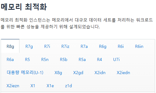 메모리 최적화 인스턴스는 RAM을 나타내는 R로 시작하거나 X1, Z1 등으로 시작하는 이름을 가지고 있으며 메모리에서 대규모 데이터셋을 처리하는 유형의 작업에 빠른 성능을 제공한다.