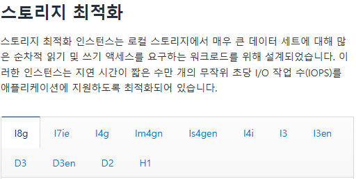 스토리지 최적화 인스턴스는 I, D, H1으로 시작하며 로컬 스토리지에서 대규모의 데이터셋에 액세스할 때 적합한 인스턴스이다.