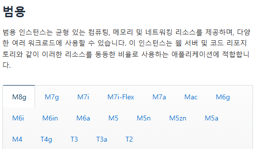 범용의 인스턴스는 M, T로 시작하는 이름을 가지고 있으며 웹 서버나 코드 저장소 같은 다양한 작업에 적합하다. 컴퓨팅, 메모리, 네트워킹 간의 균형도 잘 맞는다.