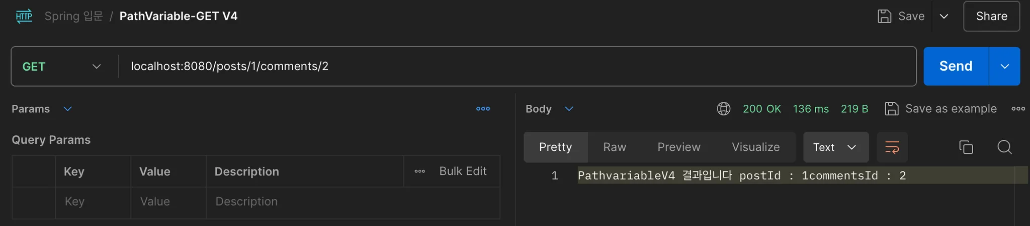 String result = "PathvariableV4 결과입니다 postId : " + postId + "commentsId : " + commentId;