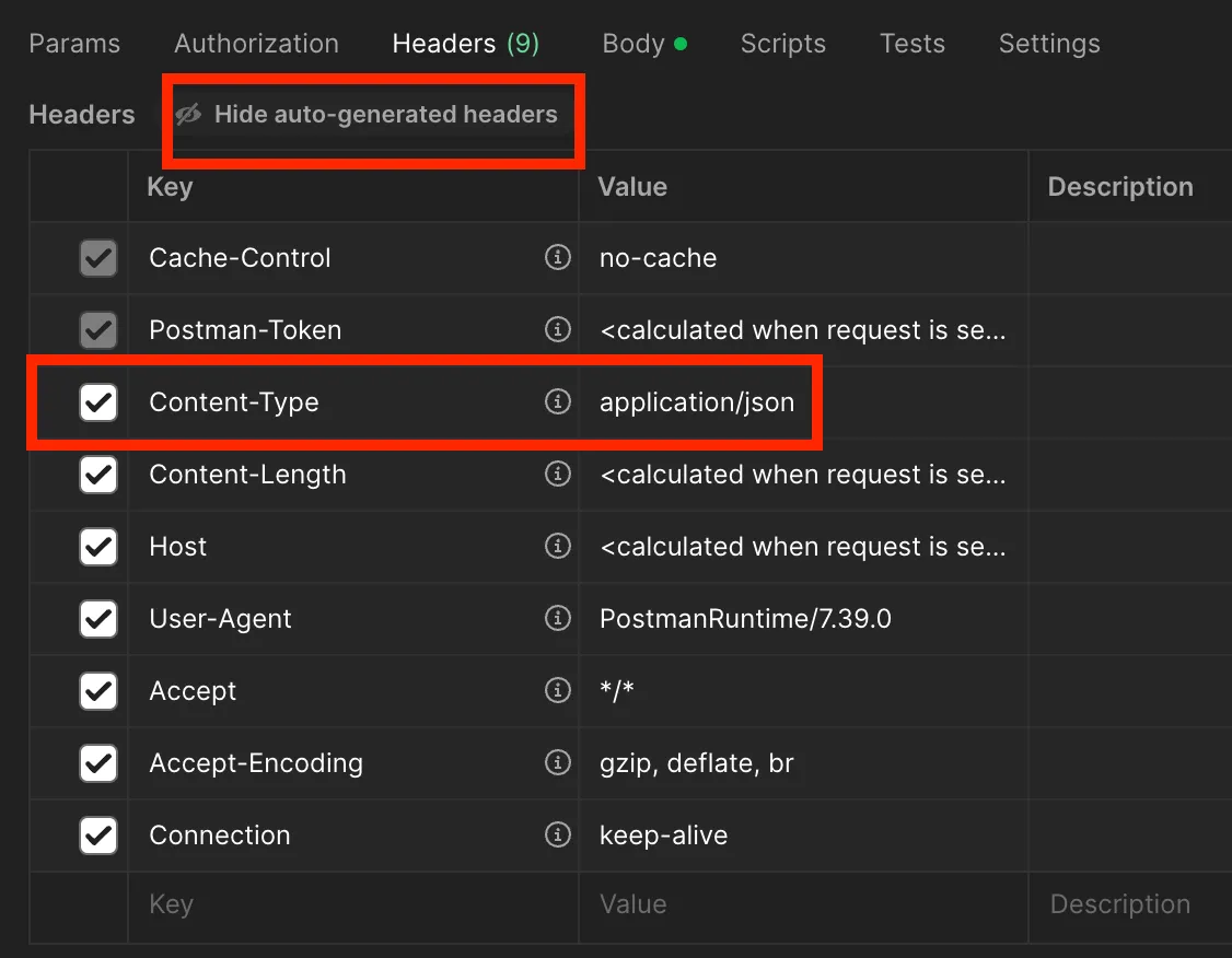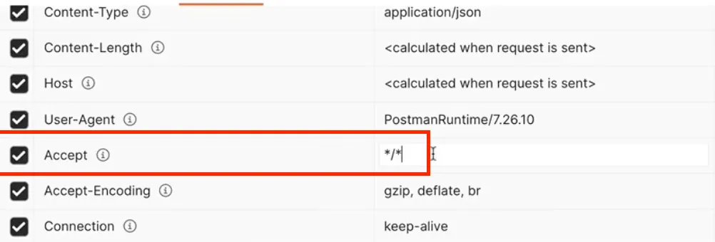 - Postman → Headers → Content-Type → Value