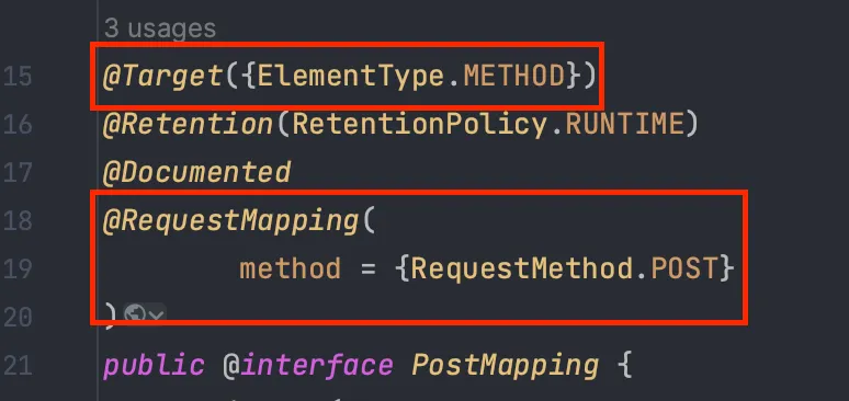 - @PostMapping, @PutMapping, @DeleteMapping, @PatchMapping의 Target은 Method Level 이다.