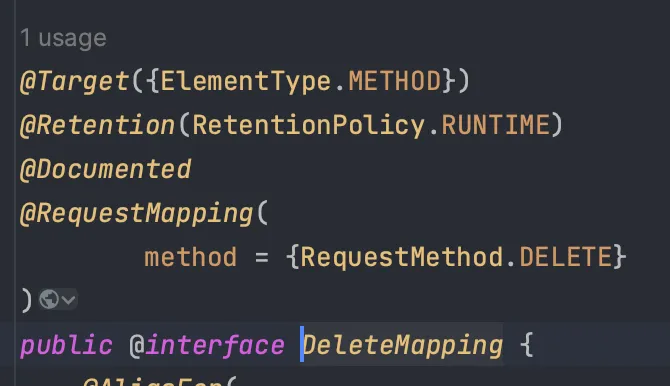 - 반면에 @RequestMapping의 Target은 class, method 레벨에 적용이 가능하다.
