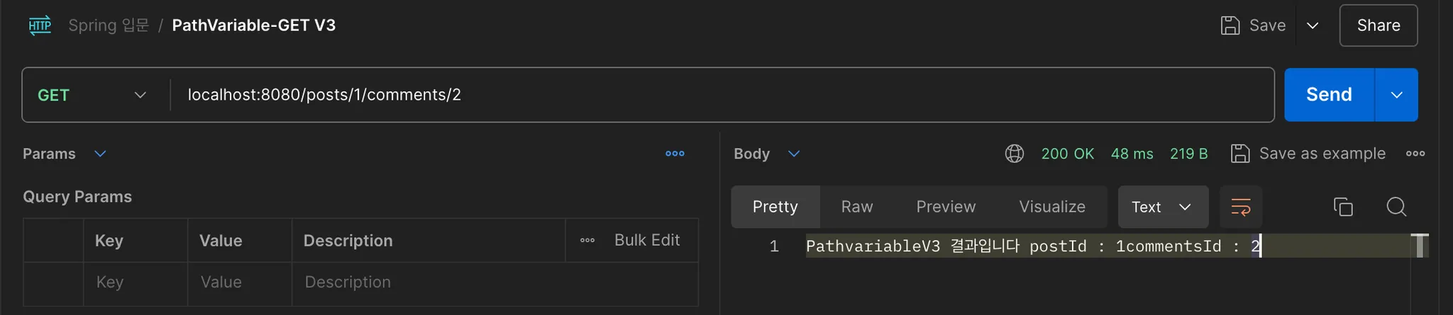String result = "PathvariableV3 결과입니다 postId : " + postId + "commentsId : " + commentId;