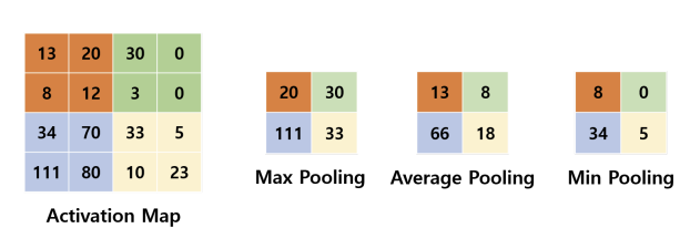 Pooling Layer는 뭐 이런 겁니다. 흠 뭐 최댓값, 평균, 최솟값을 이용해서 간략하게 표현하는 방법이 있다 정도로 보시면 되겠네요.