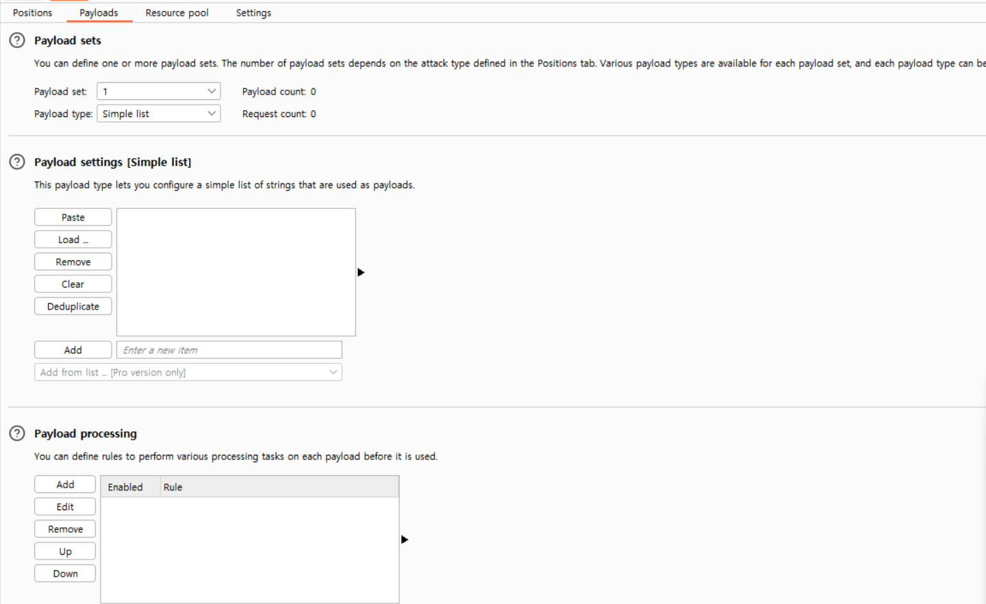 Payloads 탭에 들어가서 Payload settings에 Enter a new item 안에 아무 데이터나 넣어 주시면 됩니다. 그게 Brute Force니까요.