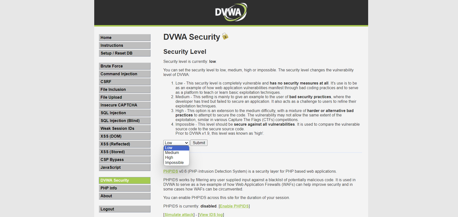 일단 DVWA Security 탭에 들어가시면 Level이 Low로 돼 있는지 확인하고 안 돼 있으면 Low로 바꿉니다.