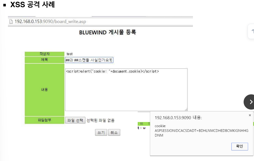쿠키 탈취랑 포스팅할 때 악의적인 코드를 삽입하는 거랑 CSRF 비슷하게 접근하면 다른 사이트로 이동되는 걸 예시로 들 수 있겠다.