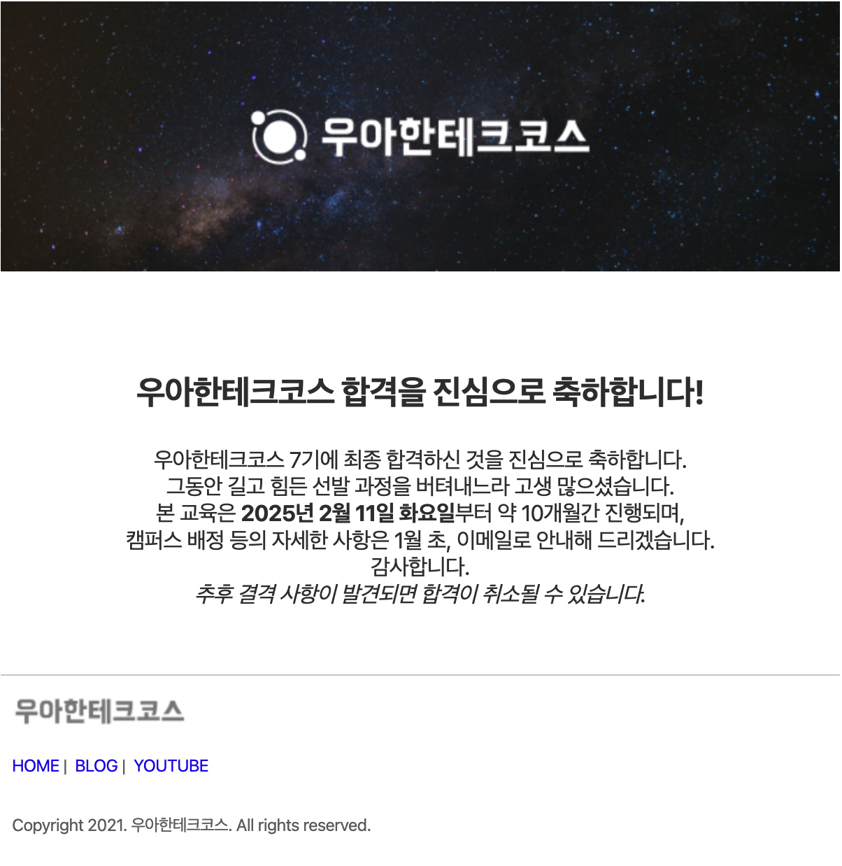 와아... 12/14에 봤던 우테코 최종 코테의 결과가 이번 27일 발표됐다. 믿기지 않게도 결과는 합격...! 프리코스부터 두 달간 우테코에 매우 몰입했기 때문에 막상 코테를 끝내고 나온 직후엔 후련한 마음이 들어 계속 웃음이 났던 기억이 난다. 엄마는 밝은 내 표정을 보고 잘본 것 같냐 기대하셨지만 내 대답은 "아니 망했어 ㅎ" 였다. 망했다면서 후련한 표정으로 계속 비식비식 웃는 나를 보며 의아해하셨지만 기능 구현도 다 못하고 나온 것치고 이상할 정도로 기분이 너무 후련해서 나도 신기했다. 그만큼 최선을 다했다는 생각이 들어 그랬던 것 같다.