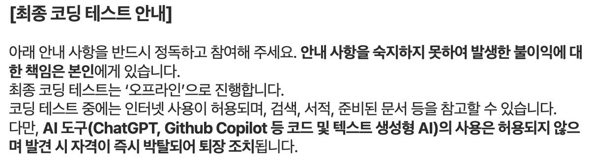 예고된 최종 코테의 주의사항은 기본적으로 오픈북이지만 AI 도구 사용은 금한다는 것이었다.