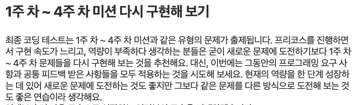 물론 이 안내에 따라 1~4주차를 다시 구현해보고 4주차는 3번이나 풀어보긴했지만 그래도 내가 끝끝내 시간 내에 못 풀었던 4주차 미션을 이 부분을 되새기며 더 깊게 풀고 분석해볼걸 하는 후회가 남았다. 지난 기수 최종 코테 문제들을 풀 시간에 말이다. ㅠㅠ 스포하자면 최종 코테는 결국 4주차 편의점과 매우 유사하게 출제되었다.