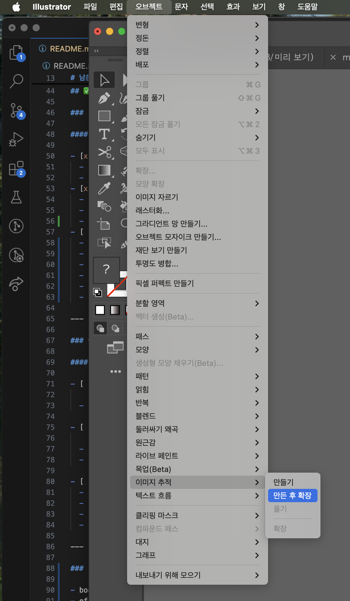 물론 나는 일러스트레이터를 다룰 줄 아니까 벡터로 선을 따는 방법도 있었지만...주어진 시간은 적고 이것도 상당히 귀찮은 작업이었다. 그래서 일러스트레이터의 "이미지 추적 후 확장" 기능을 활용해 소스 작업 시간을 단측시키고 싶었다. 하지만 저 손그림 이미지를 이미지 추적시키면 패스들이 너무 여러갈래로 쪼개져서 쓸 수 없는 수준으로 추출이 된다. 그래서 생각해낸 것이~