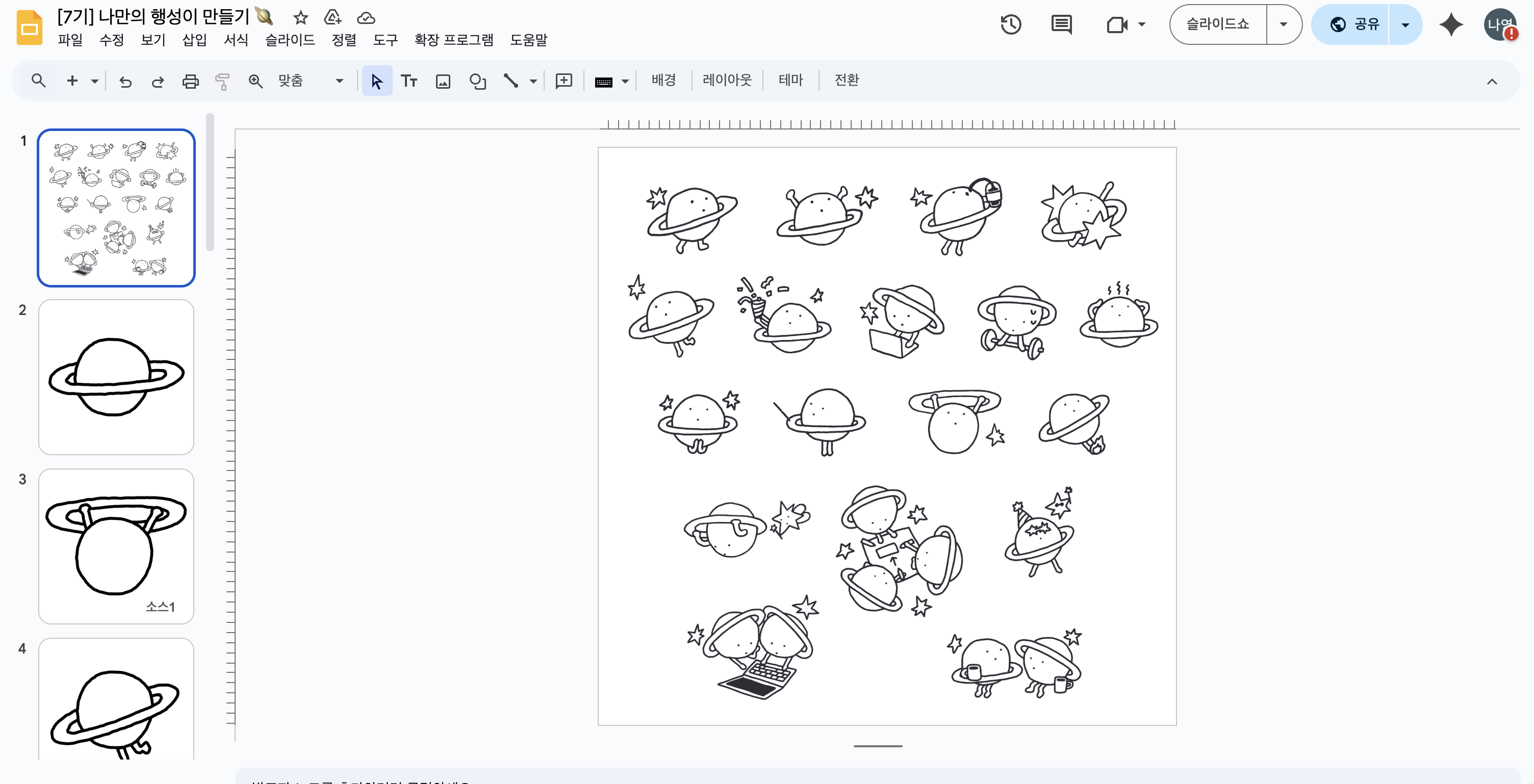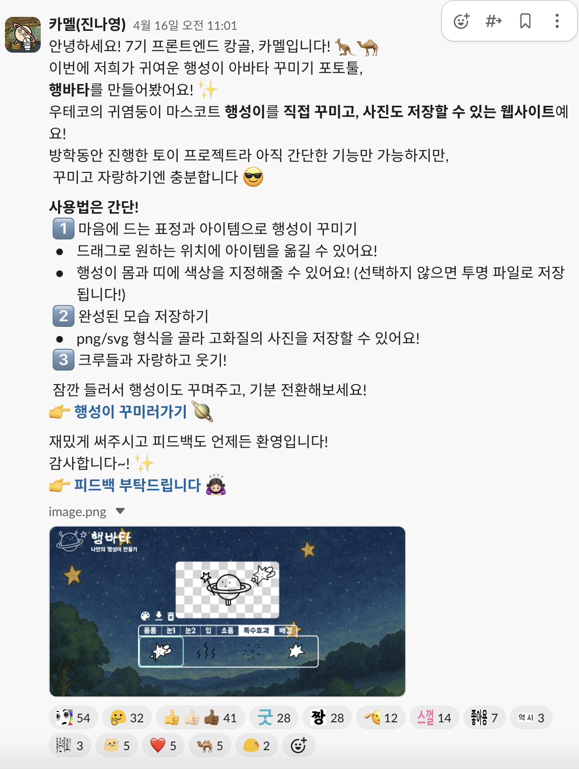 크루들 사이에서 왼손이 샤라웃해준 나만의 행성이 만들기가 유행한 적이 있다. 우테코 선릉캠 칠판엔 항상 행성이 그림들이 가득했고 크루들의 슬랙 프사도 하나 둘 행성이가 되어갔다.