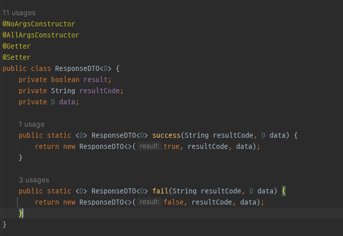 컨트롤러 레이어에서는 이 코드를 분석하여 오류에 맞는 결과를 담은 response 객체를 브라우저로 반환합니다. 뷰(view) 레이어에서는 치명적이지 않은 오류의 경우 ResponseDTO.success로 객체를 반환받아 다음 단계를 진행하며, 치명적인 오류가 발생하면 fail로 객체를 반환받아 오류 메시지를 출력합니다.