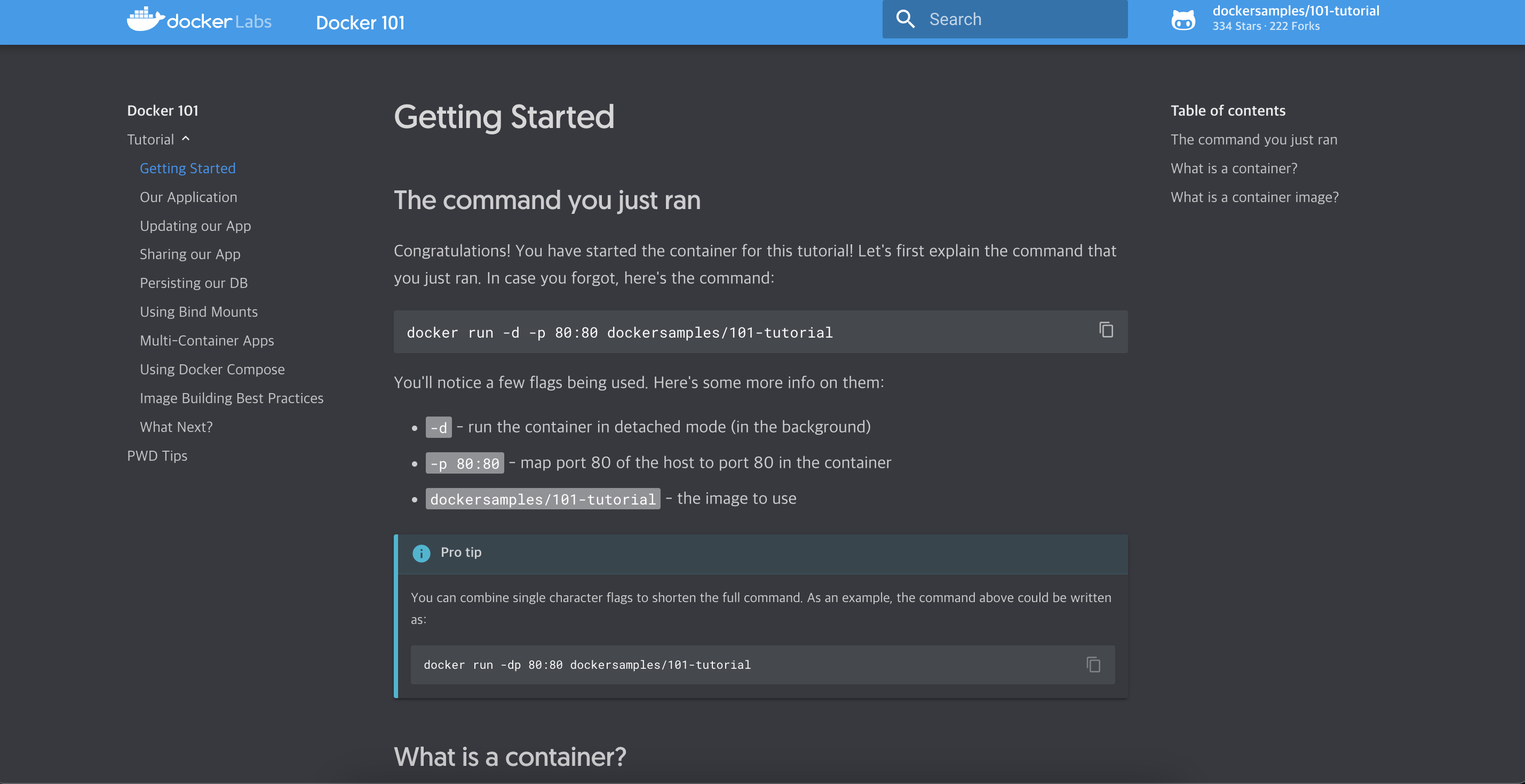게시한 포트에 접근하면 위와같이 도커에서 제공하는 튜토리얼 사이트가 나온다