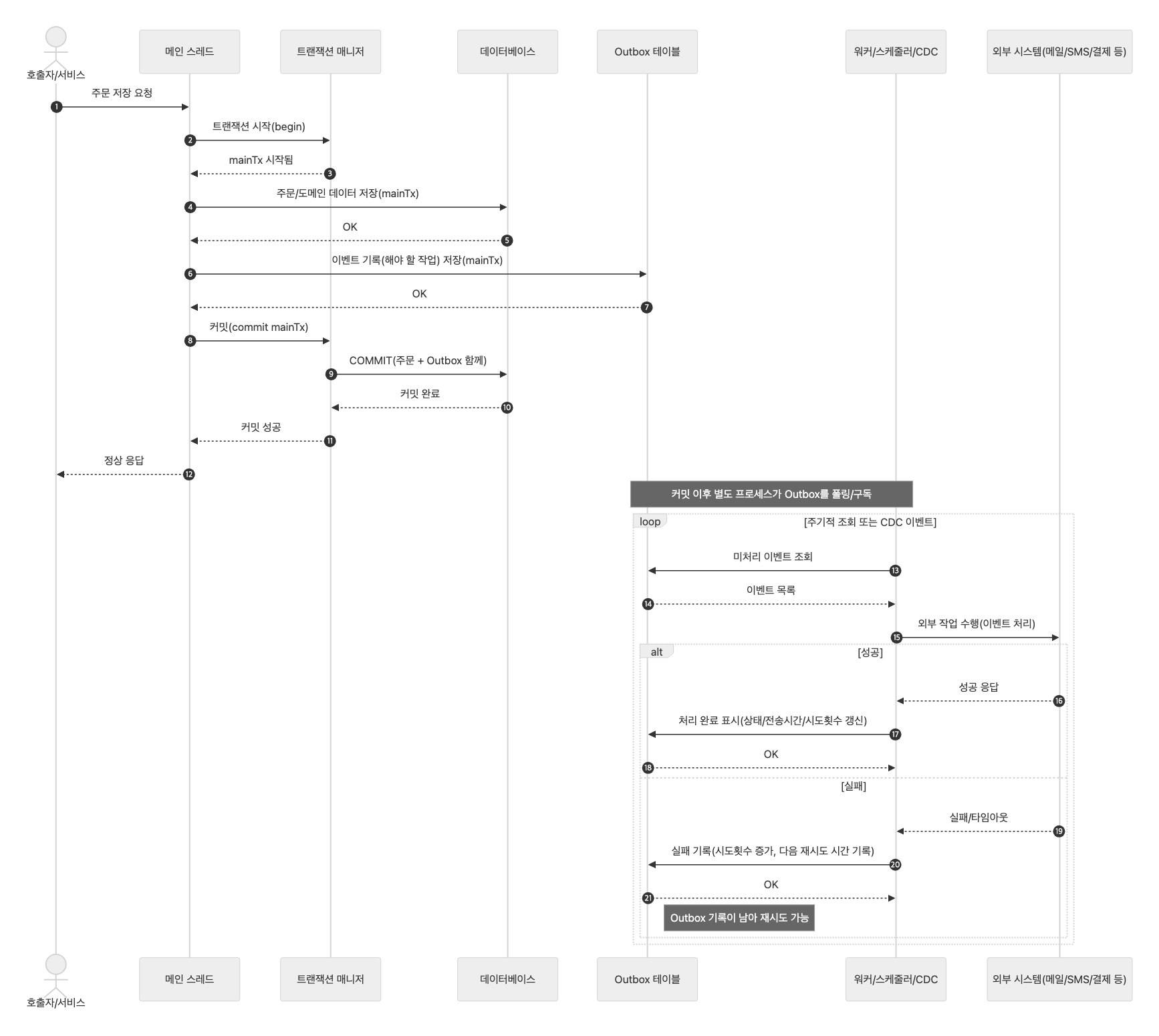 보상 트랜잭션이 “되돌리는 설계”라면, Outbox는 “확실히 실행되게 만드는 설계”에 가깝습니다.