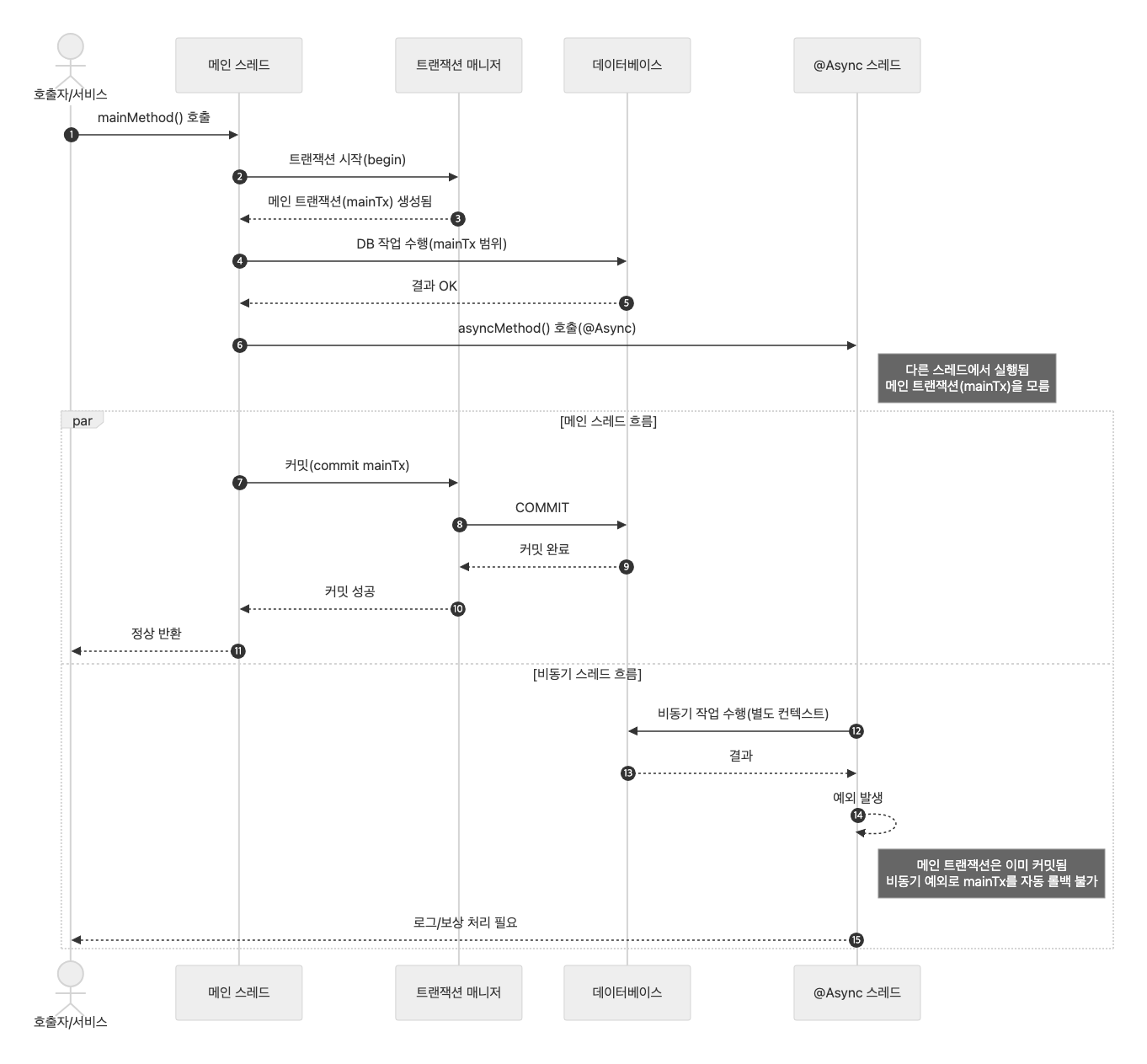 @Async 메서드는 다른 스레드에서 실행되며 메인 트랜잭션을 모릅니다시퀀스 다이어그램으로 확인해보면 아래와 같습니다.