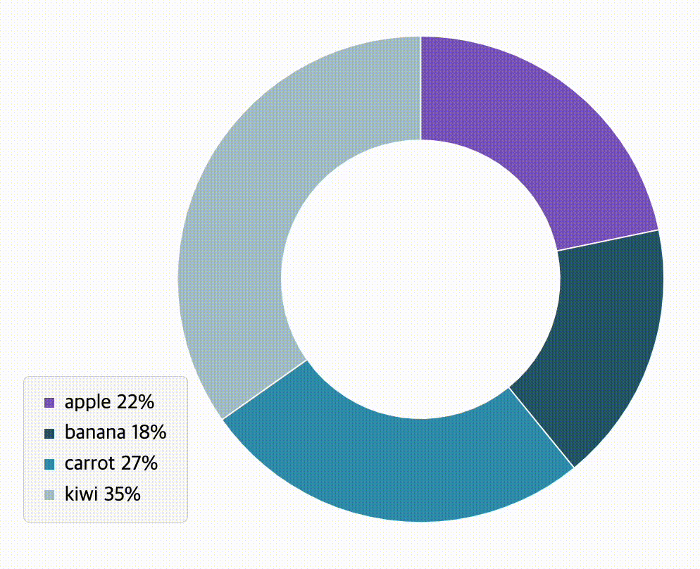 element의 시작 각도는 이전에 그렸던 요소의 각도 이후로 시작하여야 한다. 위 코드를 보면, banana의 시작 각도는 apple의 끝 각도이고, banana의 끝 각도는 apple의 값에 자신의 값을 더한 것을 볼 수 있다.