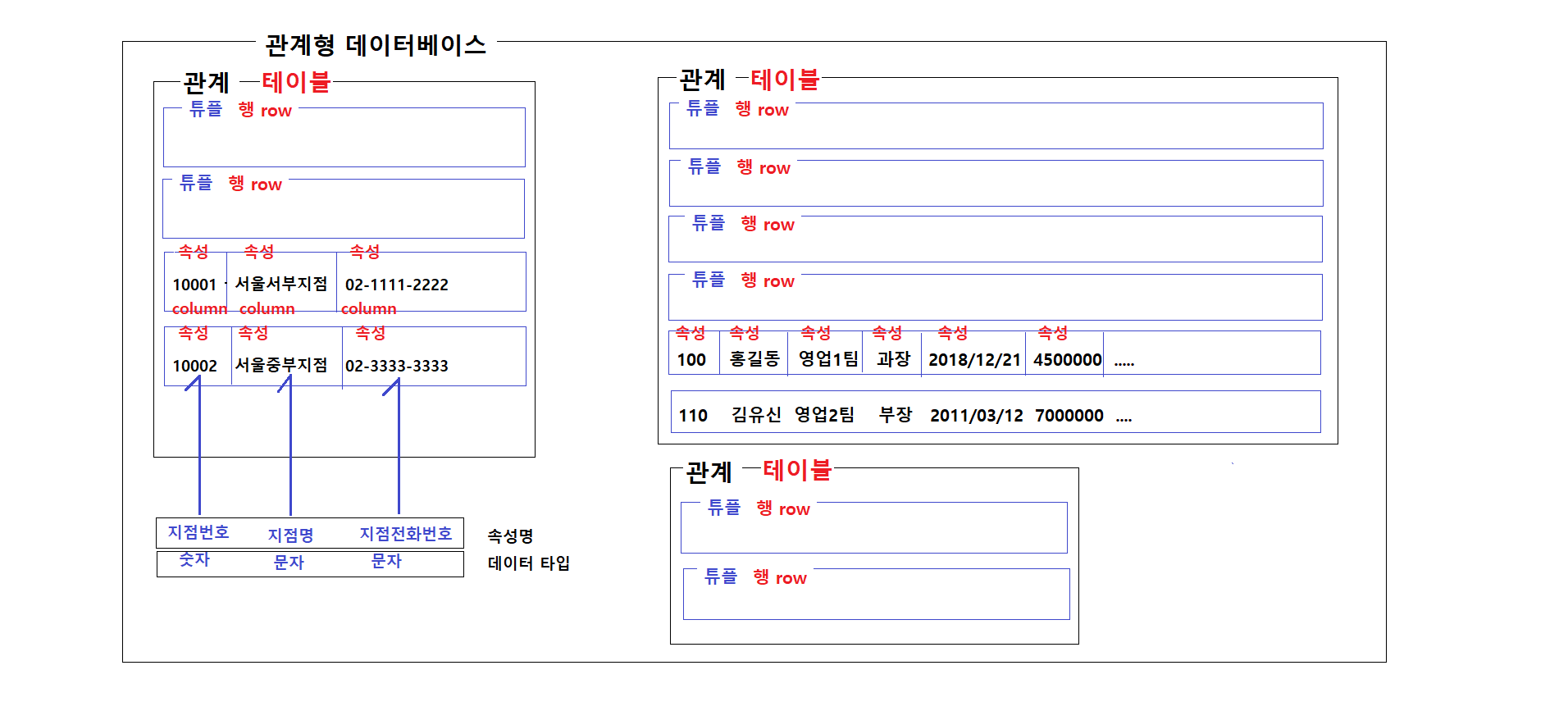 관계형 모델에서는 데이터베이스를 관계(Relation)의 집합으로, 관계를 행(Tuple)의 집합으로, 행을 속성(Attribute)의 집합으로 보는 것.