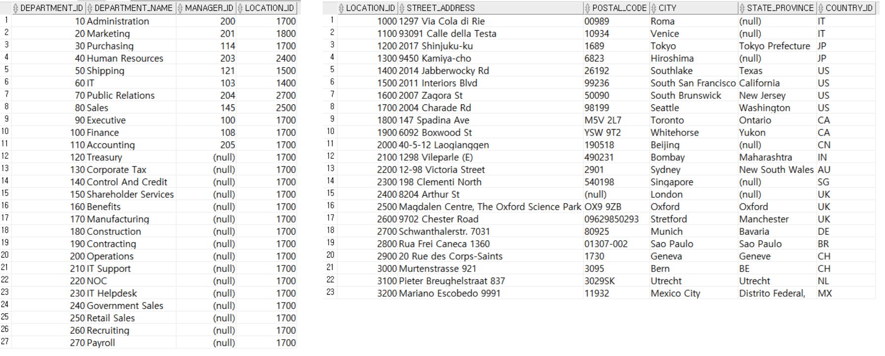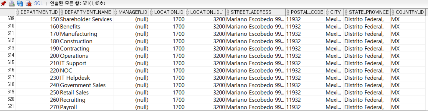 DEPARTMENTS테이블과 LOCATIONS테이블을 크로스 조인했다. DEPARTMENTS테이블의 한 행당, LOCATIONS테이블의 모든행이 연결된다. 그래서 27*23으로 621개의 행이 출력되었다.