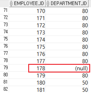 EMPLOYEE_ID가 178인 행은 조인 결과에 포함되지 않았는데, 이는 EMPLOYEES테이블에서 EMPLOYEE_ID가 178인 행의 DEPARTMENT_ID가 NULL이기 때문이다.