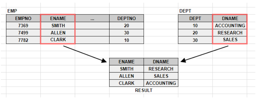 예를 들어, EMP테이블에 있는 사원들이 속한 부서이름을 알고 싶다. 그러나 EMP테이블에는 사원들이 속한 부서의 부서번호(DEPTNO)만 있을 뿐, 부서이름은 존재하지 않는다. 부서이름은 DEPT테이블에 존재한다. 그래서 EMP테이블과 DEPT테이블을 조인하여 원하는 데이터를 조회한다.
