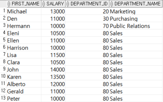 EMPLOYEES 테이블과 DEPARTMENTS 테이블을 조인했다. 그리고 각 테이블의 DEPARTMENT_ID가 같고 EMPLOYEES 테이블의 SALARY가 10000이상인 행을 출력했다.