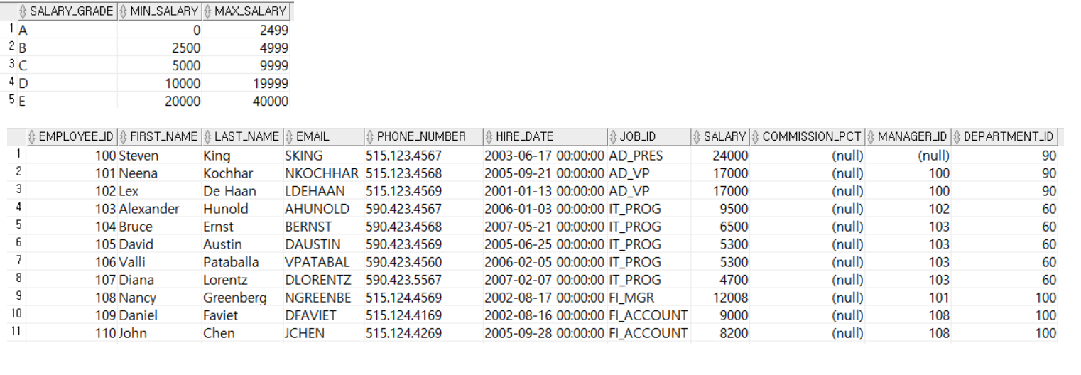 SALARY_GRADES 테이블은 MIN_SALARY와 MAX_SALARY에 따라 SALARY_GRADE가 나뉘어 진다. SALARY_GRADES 테이블과 EMPLOYEES 테이블을 조인한 후, EMPLOYEES 테이블의 SALARY가 SALARY_GRADE의 어느 등급에 속하는지 출력한다.