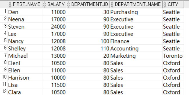 SELECT E.FIRST_NAME, E.SALARY, E.DEPARTMENT_ID, D.DEPARTMENT_NAME, L.CITY