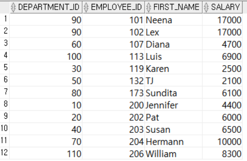 SELECT DEPARTMENT_ID, FIRST_NAME, SALARY