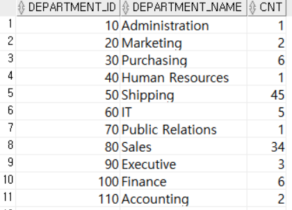 WHERE B.DEPARTMENT_ID = A.DEPARTMENT_ID) AS CNT