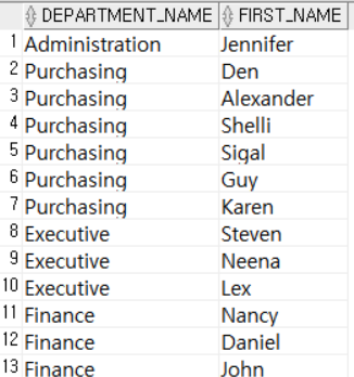 위에서 획득한 Seattle의 LOCATION_ID를 통해 Seattle에 위치한 부서의 DEPARTMENT_ID를 획득했다. 총 21개의 DEPARTMENT_ID를 획득했고, 마지막으로 이 부서에 속한 직원들의 이름과 소속 부서 이름을 조회한다. 최종 결과는 다음과 같다.
