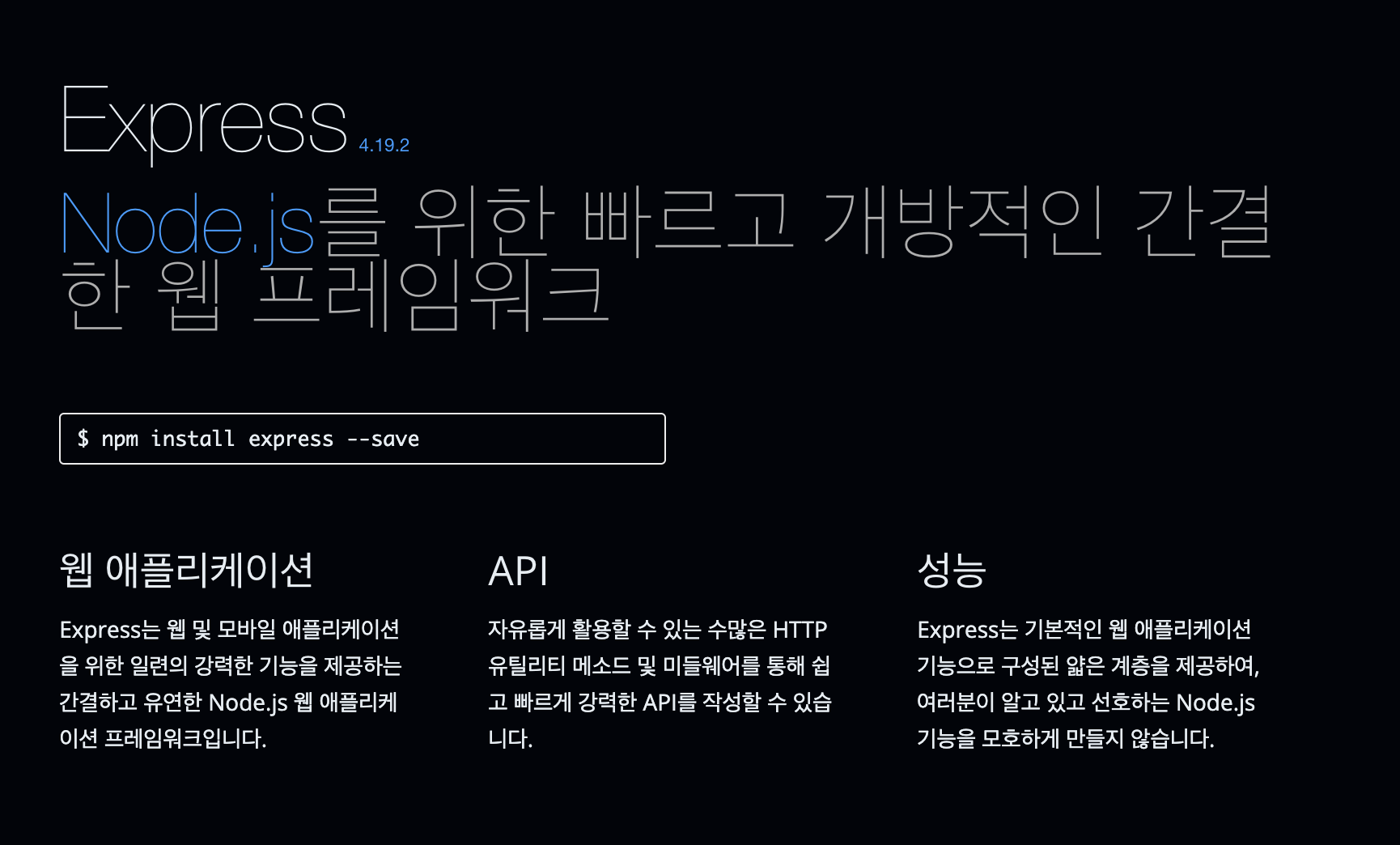 각각의 모듈은 어딘가에 따로 구축이 되어있고 npm은 이를 모아둔 인스톨러(express는 홈페이지가 따로 있음 https://expressjs.com)