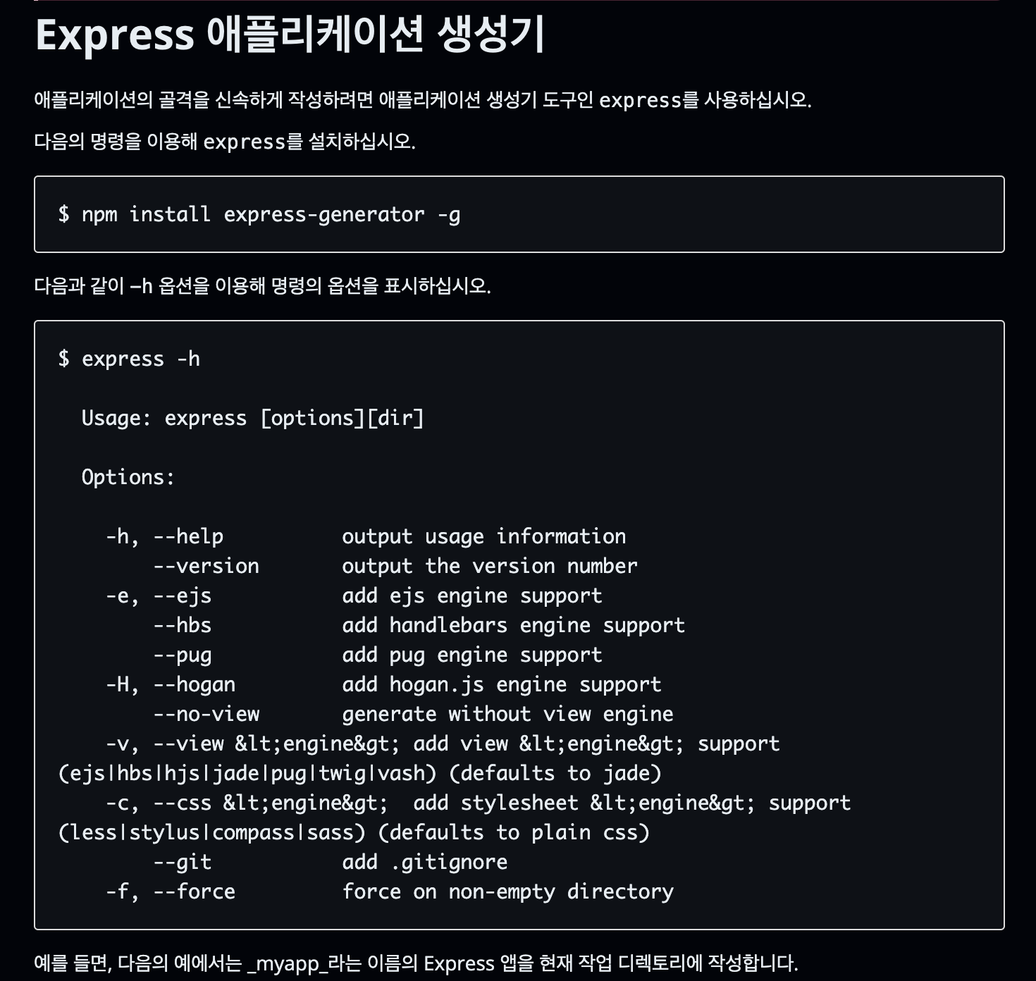 어플리케이션 골격을 신속하게 작성한다는 것은, express로 하나의 프로젝트를 하기 위해서 기본적인 골격을 만들어 준다는 것